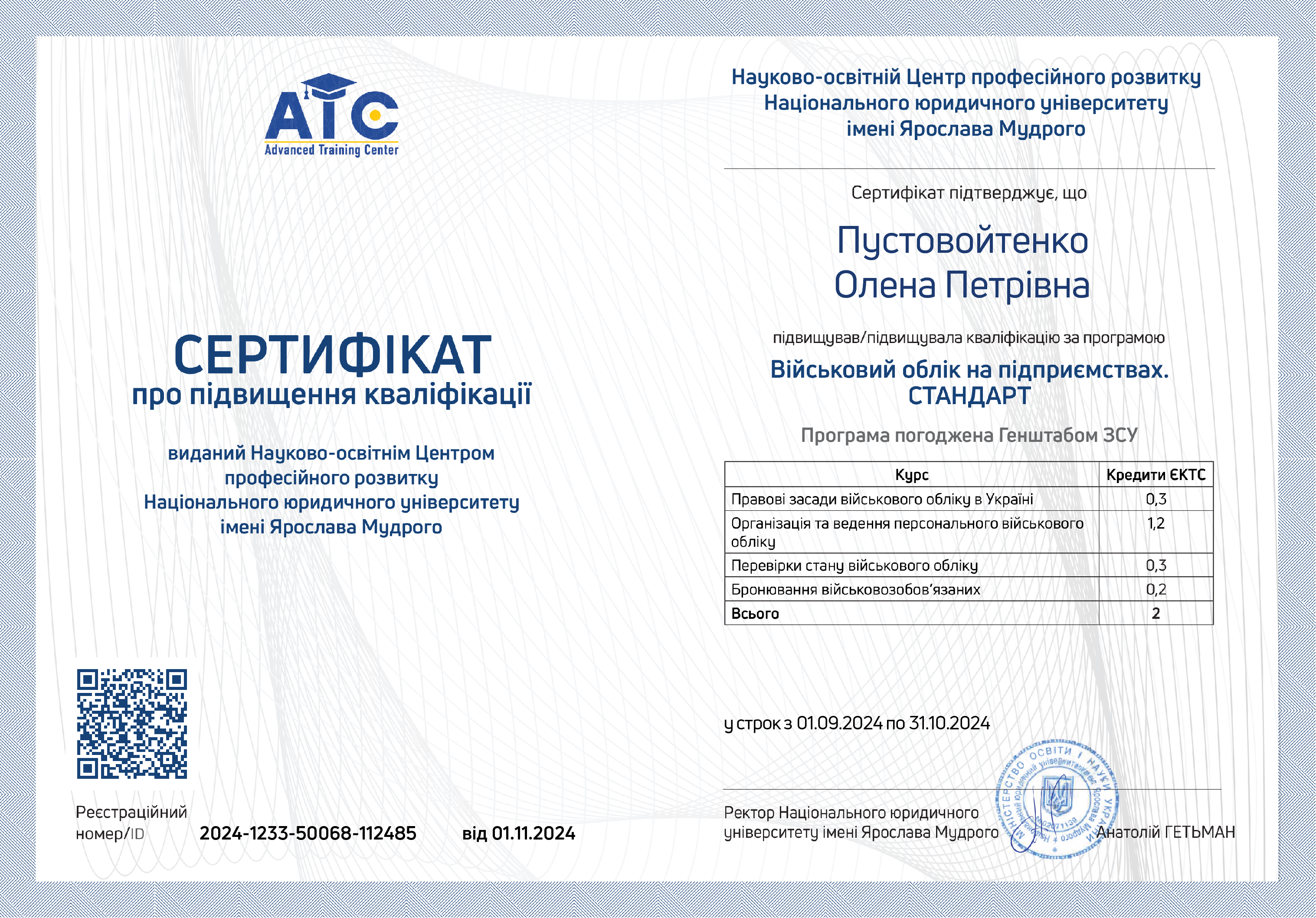 підвищував(-ла) кваліфікацію за програмою Військовий облік на підприємствах. СТАНДАРТ