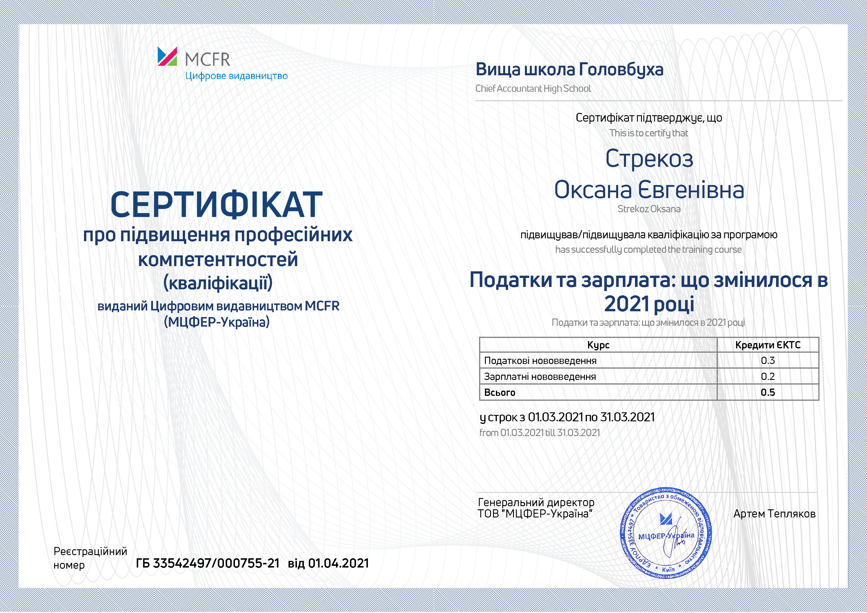підвищувала кваліфікацію за програмою Податки та зарплата: що змінилося в 2021 році у строк з 01.03.2021 по 31.03.2021