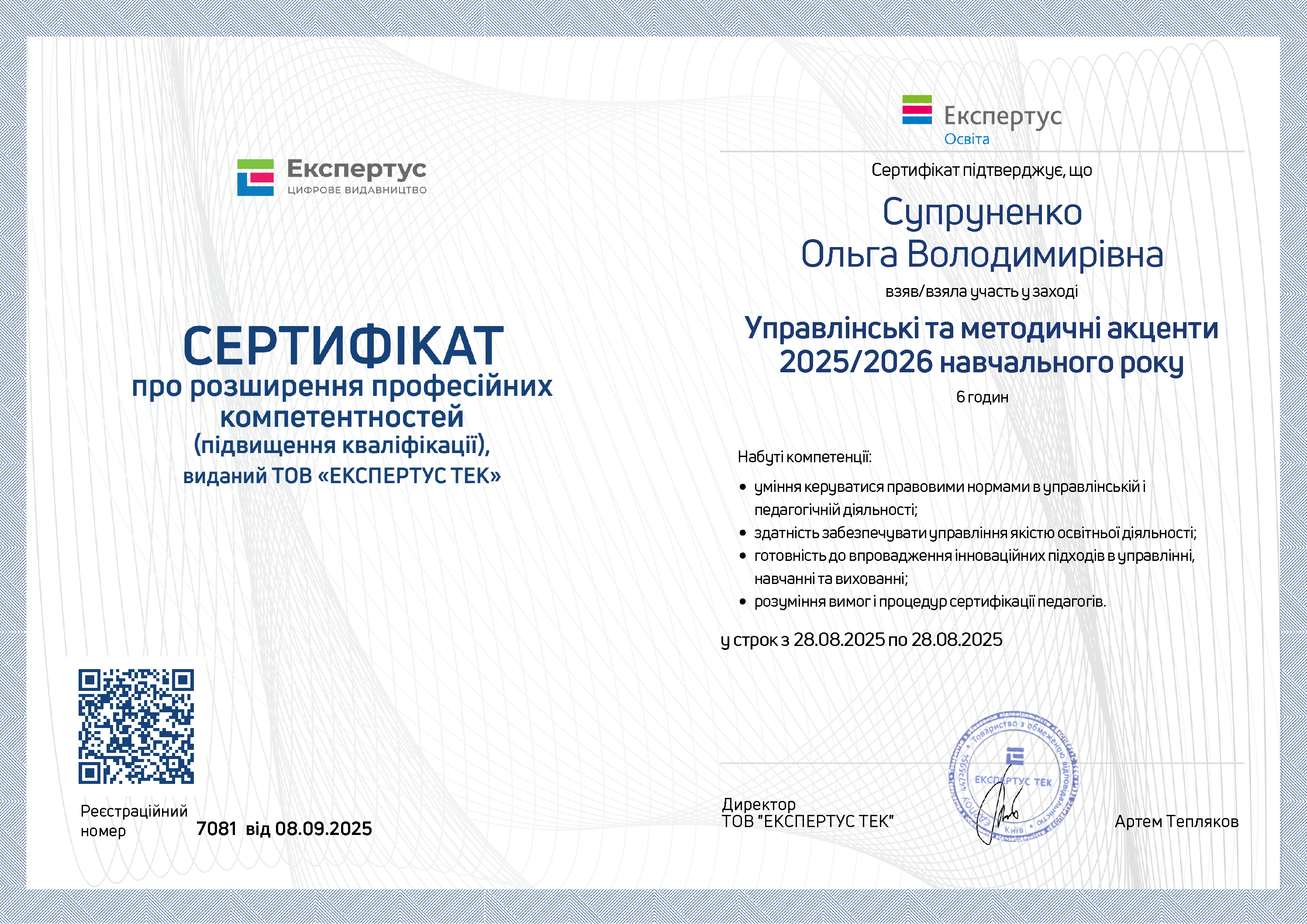 підвищувала кваліфікацію за програмою Управлінські та методичні акценти 2025/2026 навчального року у строк з 28.08.2025 по 28.08.2025